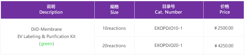 Extracellular vesicles (EVs) are membrane-derived particles surrounded by a phospholipid bilayer that are released by cells. We use DiO dye to efficiently label EV membranes. Then the excess unbound dyes are fast removed through our excellent Spin Columns from labeled exosome preparations, which separate molecules on the basis of the differences in size. Contaminant removal is easier and faster than traditional clean-up methods such as ultracentrifugation, spin filters.