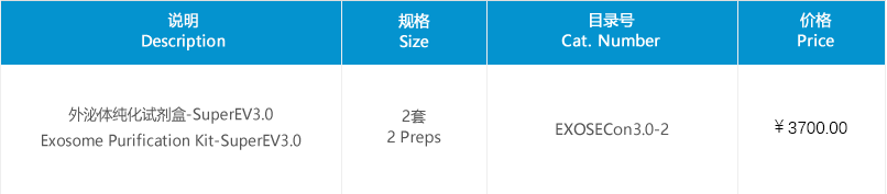 尺寸排阻色譜法(SizeExclusionChromatography,SEC)被認(rèn)為是從不同樣 本中分離和純化 EVs 的最佳方法之一,因?yàn)樗軌蚩焖俣行У貙?EVs 從復(fù)雜 樣本中分離出來(lái),并能保持 EVs 的原始形狀和生物學(xué)功能。我們開(kāi)發(fā)了用于分 離 EVs 的不同類型的 SEC 柱:SuperEV0.5,SuperEV1.0 和 SuperEV3.0,適合 不同樣本和體積的 EVs 分離。針對(duì)獲得的餾分再通過(guò) EVs 濃縮柱,基于凝膠樹(shù) 脂層析實(shí)現(xiàn)餾分的濃縮和進(jìn)一步純化。此種組合得到的 EVs 不僅純度更高,優(yōu) 于超速離心,而且保持 EVs 的生物學(xué)功能,適合 EVs 蛋白質(zhì)質(zhì)譜分析,RNA 高 通量測(cè)序和 EVs 的體內(nèi)外細(xì)胞實(shí)驗(yàn)等。另外,還可用于大量制備適合于臨床應(yīng) 用的 EVs 產(chǎn)品。