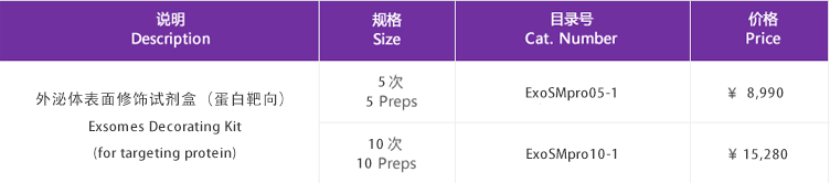 本試劑盒表面修飾效率高,反應(yīng)條件溫和,生理條件下即可發(fā)生反應(yīng),反應(yīng)特異性好,無有害副產(chǎn)物,不需額外添加催化劑或其他化學物質(zhì),不會損傷外泌體膜結(jié)構(gòu),也不影響目標蛋白的生物活性和功能,為靶向外泌體提供了一種高效、簡便的修飾手段,可實現(xiàn)靶向外泌體的大規(guī)模制備。