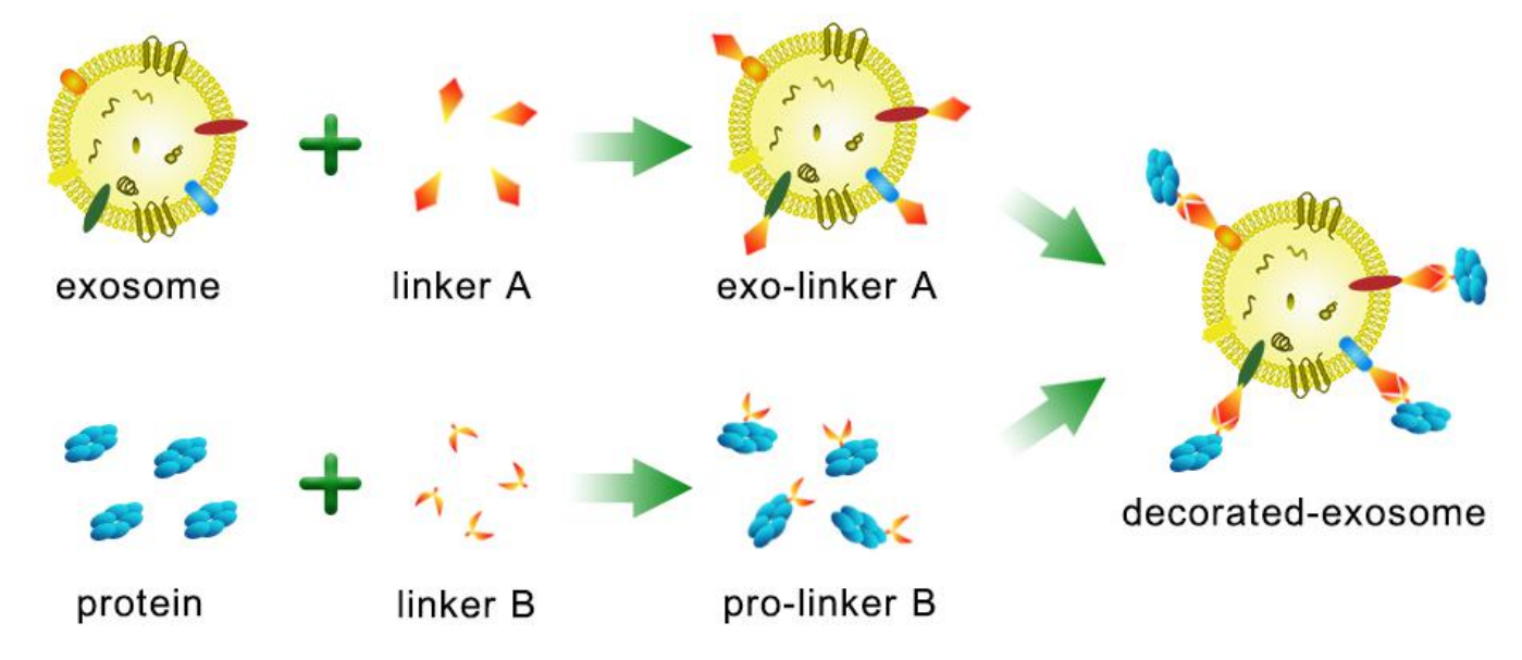 本試劑盒避開繁瑣的基因克隆步驟,通過點擊化學反應(yīng),直接在提取的外泌體表面修飾目標蛋白。首先將點擊化學 linker A 分子共價偶聯(lián)在外泌體表面,形成 exo-linker A,點擊化學 linker B 分子與靶向蛋白共價偶聯(lián),形成 pro-linkerB,各自純化,去除剩余的 linker 分子。然后將 exo-linker A 和 pro-linker B 孵育,兩個 linker 之間發(fā)生快速高效的點擊化學反應(yīng),以共價鍵形式將目標蛋白偶聯(lián)在外泌體表面,最后采用 SEC 分子排阻柱將剩余的 pro-linker B去除,得到大量純凈的修飾外泌體。