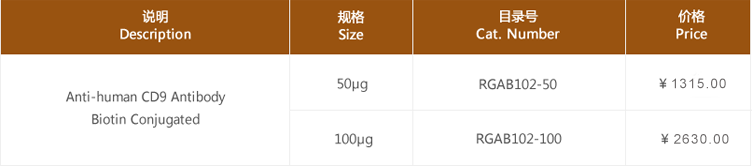 CD9 is a 24 kD type III transmembrane protein. It is a member of the tetraspan family (spanning the membrane four times) found on platelets, B cell progenitors, activated lymphocytes, granulocytes, endothelial cells and epithelial cells. CD9 is also abundant in exosomes embranes.Rengen Biosciences provides two anti-CD9 monoclonal antibodies, unconjugated or biotin conjugated, able to recognize the antigen with high efficiency in ELISA and flow cytometry applications in both cell lines and exosomes.