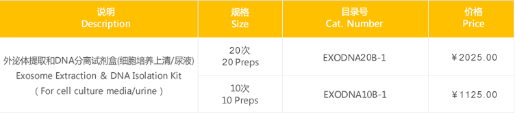 細胞培養(yǎng)上清或尿液外泌體提取和DNA分離試劑盒是包括外泌體提取和后續(xù)DNA分離、純化。首先,應(yīng)用優(yōu)化的外泌體提取試劑富集血清或血漿中外泌體,然后通過采用優(yōu)化的裂解液提取外泌體中DNA,通過吸附柱(Spin Columns)可方便、快捷地純化和洗脫外泌體DNA,可直接用于下游應(yīng)用,如realtime PCR,NGS 測序和microarray等。另外,純化的DNA是來自外泌體中DNA,而不含有細胞培養(yǎng)上清或尿液中蛋白質(zhì)結(jié)合的DNA(protein-bound circulating DNA)。